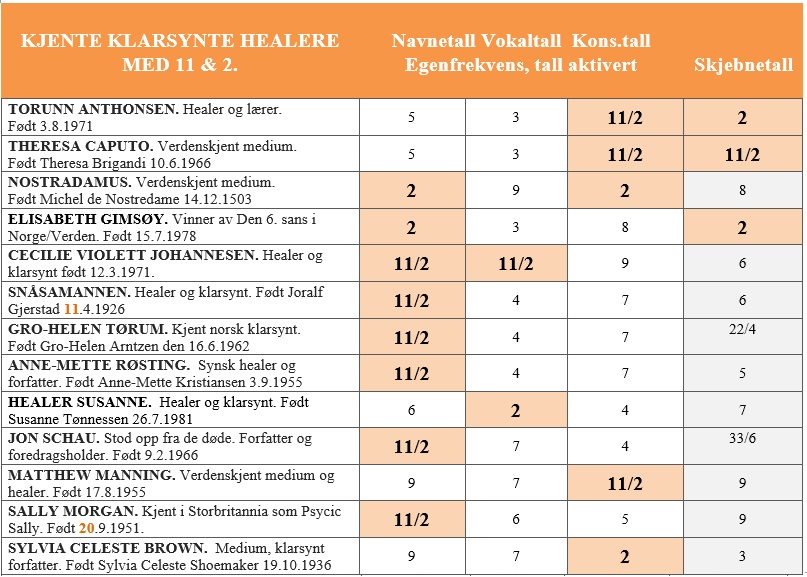 Skapelsen bygger på lyd og vibrasjoner som er aktivert i oss via våre fødselsdata, som vi kan oversette til tall med Numerologi. Som vi ser står 11 & 2 frem, samtlige er utstyrt med det blant sine kjernetall.